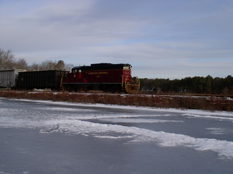 January 24, 2004: Bay Colony has borrowed Cape Cod Central Railroad GP-7 No. 1501, and it's the power for today's trash train. We begin in Bourne, near Canal Jct., and follow them to Yarmouth. |