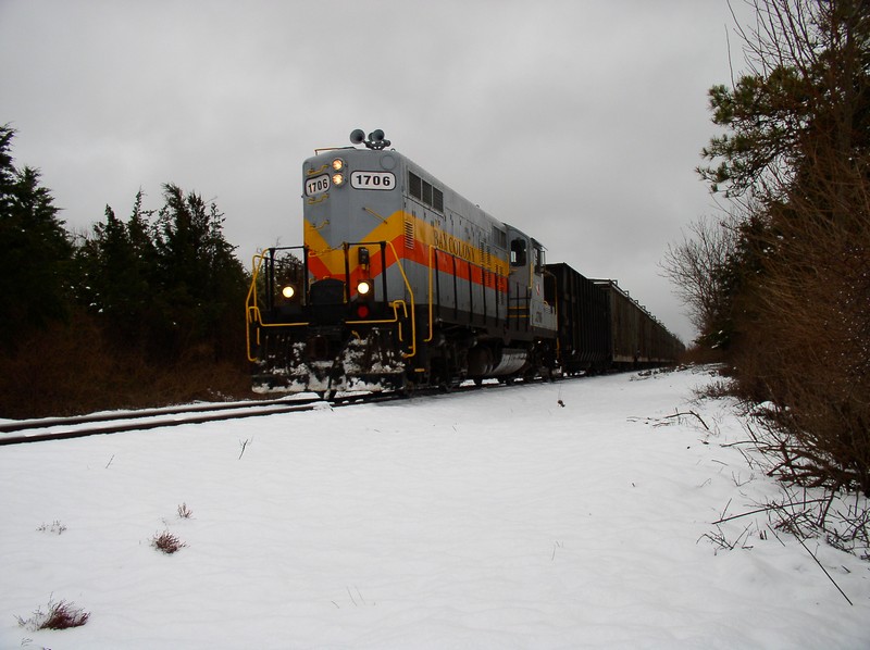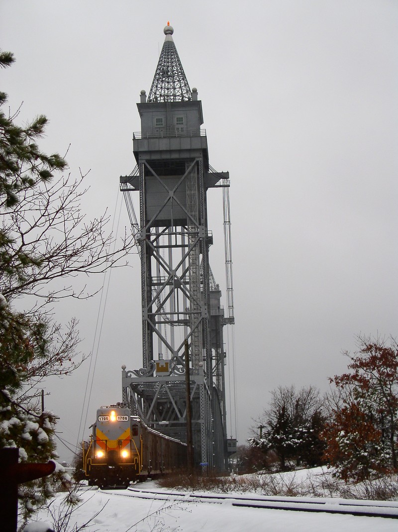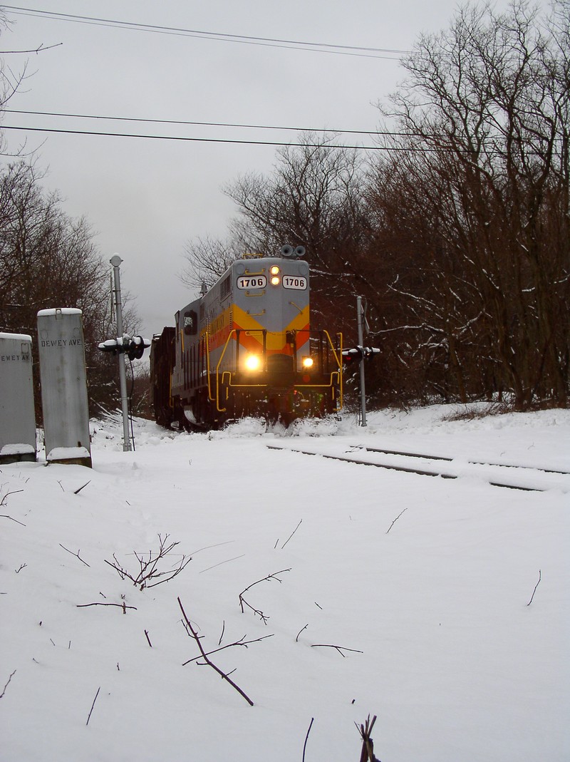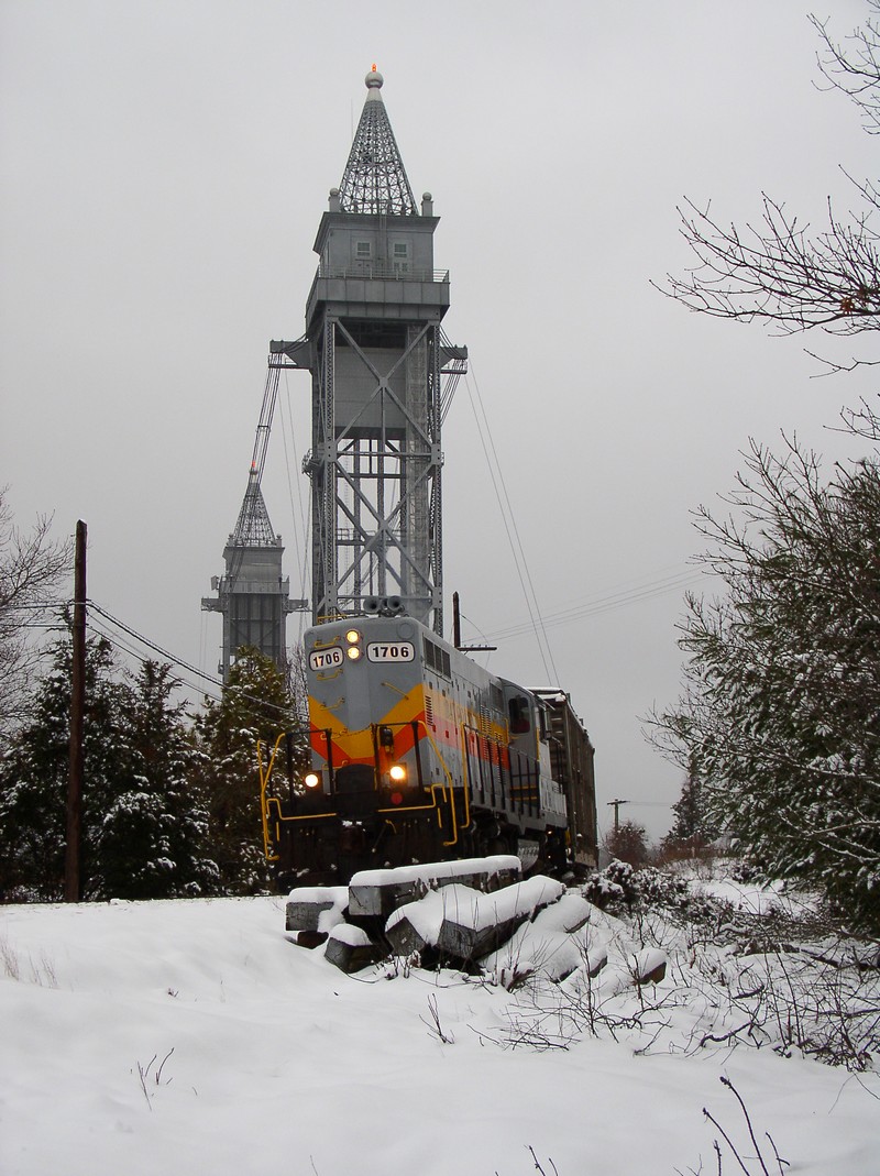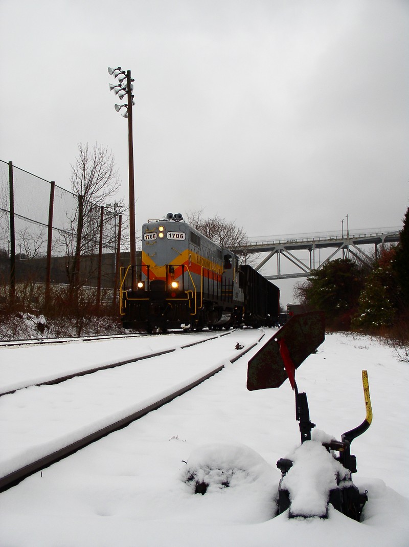 January 12, 2005: Bay Colony GP-9 No. 1706 is hauling eleven empty trash cars back to Yarmouth on this snowy morning. We begin at Canal Junction, where 1706 has returned from delivering the empty cars to the Otis transfer station, and is now headed for Yarmouth. Once they shove back onto the bridge off of the Falmouth Line, the switch at Canal Jct. is lined for the Cape Main, and the train heads south. This morning's run also included a stop at Gallo Construction, underneath the Sagamore bridge, to pick up a loaded gondola car of flyash (trucked from the Canal Electric plant). After they switch out Gallo, we follow them on their southbound trek. | ||