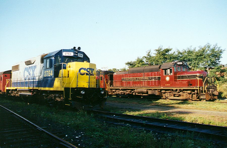Borrowed CSXT GP38-2 No. 2764 sits on track 7 in the Hyannis yard, ready to haul the day's scenic trains, while RS3m No. 1201, on track 9, will take care of the evening dinner train. Summer 2000 |