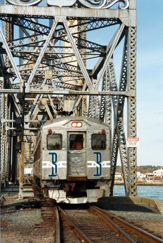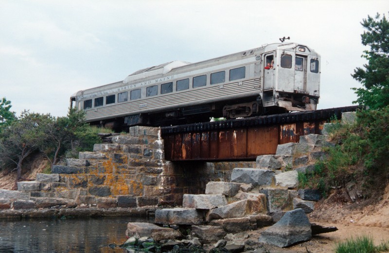 CCR RDC-1 "Budd Car" No. 6126, relettered for its native B&M, is just coming off the railroad bridge and onto the Cape in this early-to-mid 1990s view. |