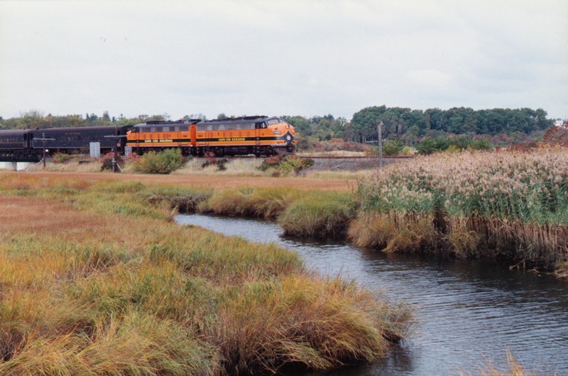 CCR GP-9 No. 1823 leads a scenic excursion train past Hoxie Pond in East Sandwich in a typical scene from the mid-1990s. |